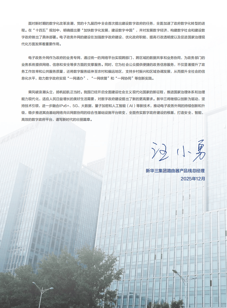 未来,新华三将持续融合前沿技术,深化场景化方案创新,携手生态伙伴优化数字化基础设施,助力电子政务外网向云网数协同的综合性基础设施平台转变,为数字政府建设夯实基础,推动社会治理现代化进程。