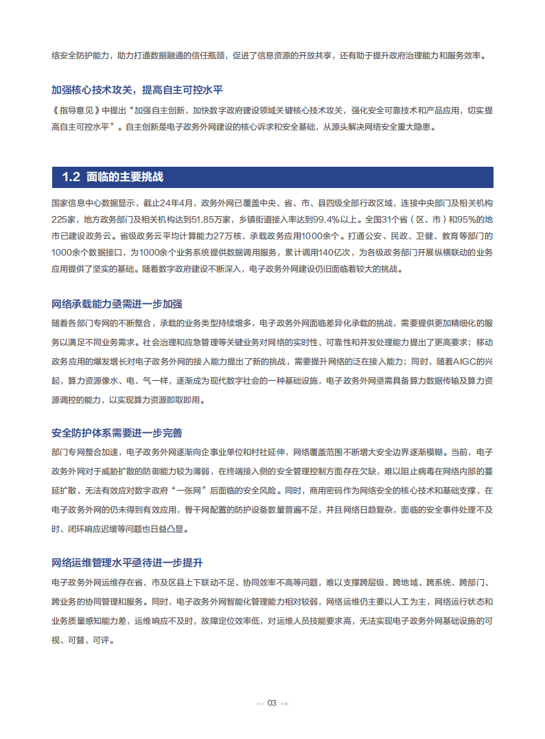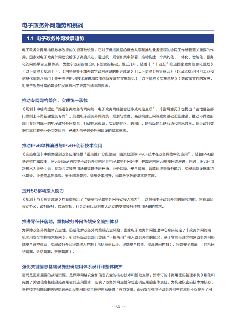 电子政务外网作为数字政府关键基础设施,在政策驱动下呈现专网整合、IPv6+应用、5G移动接入强化、零信任落地等发展趋势,但也面临网络承载能力不足、安全防护体系不完善、运维管理水平待提升等挑战。
