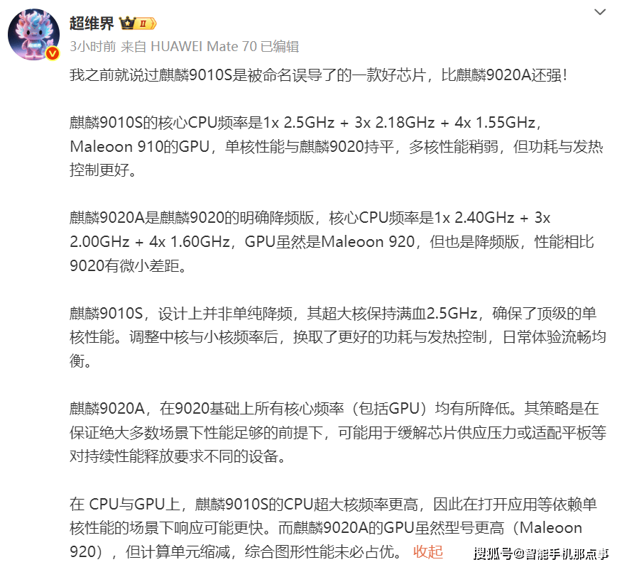 但是从博主透露的信息来看,麒麟9010S的大核频率保持在与麒麟9020持平的水平,而麒麟9020A则是麒麟9020的明确降频版。