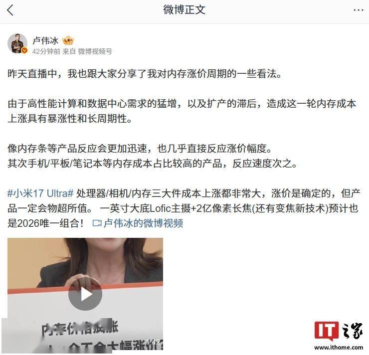 IT之家注意到,卢伟冰还再次谈及了小米 17 Ultra 的涨价。他称新机的处理器 / 相机 / 内存三大件成本上涨都非常大,涨价是确定的,但产品一定会物超所值。一英寸大底 Lofic 主摄 +2 亿像素长焦 (还有变焦新技术) 预计也是 2026 唯一组合。