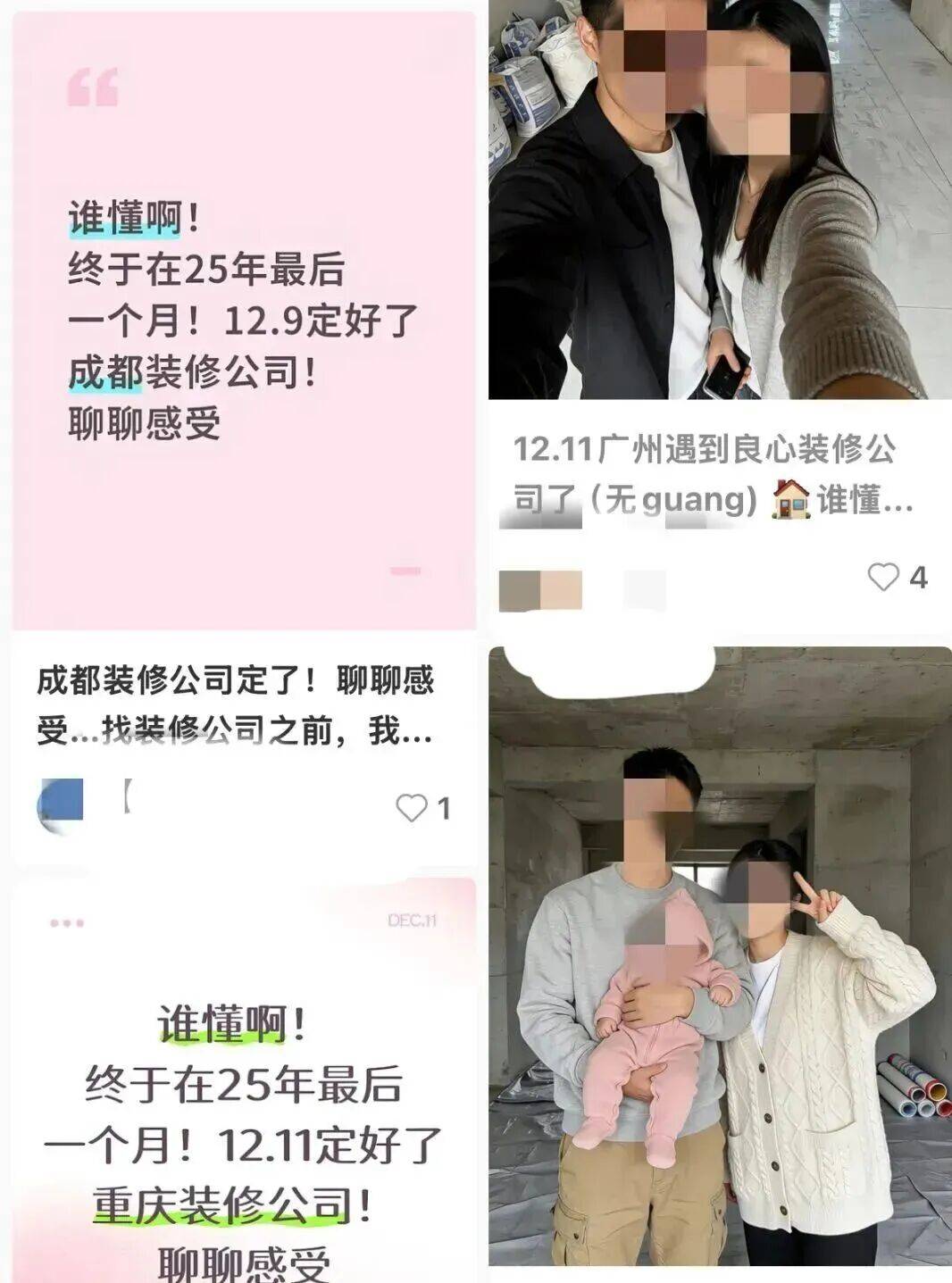 这些帖子的封面图高度相似:几乎是一对笑容灿烂的“夫妻”站在新家门口合影,部分“夫妻”还怀抱婴儿,营造出“真实业主入住”的场景