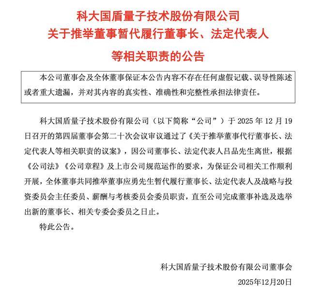 12月19日晚间,国盾量子发布公告称,因公司董事长、法定代表人吕品先生离世,全体董事共同推举董事应勇先生暂代履行董事长、法定代表人及战略与投资委员会主任委员、薪酬与考核委员会委员职责,直至公司完成董事补选及选举出新的董事长、相关专委会委员之日止。