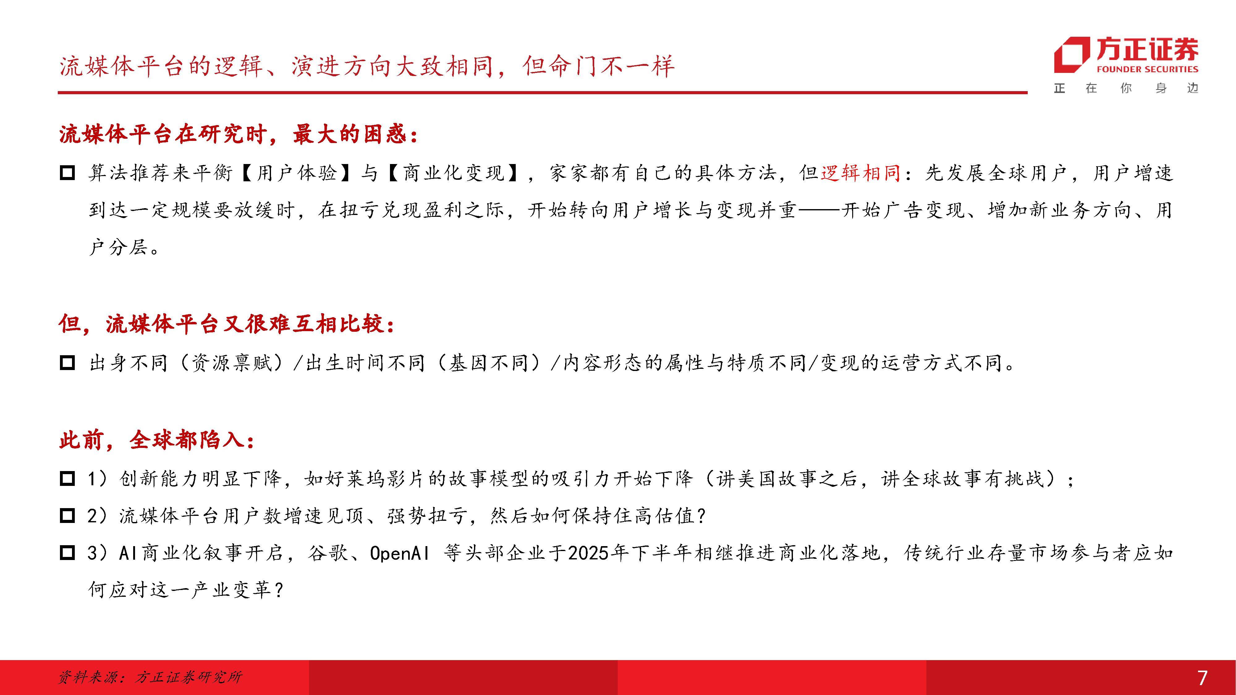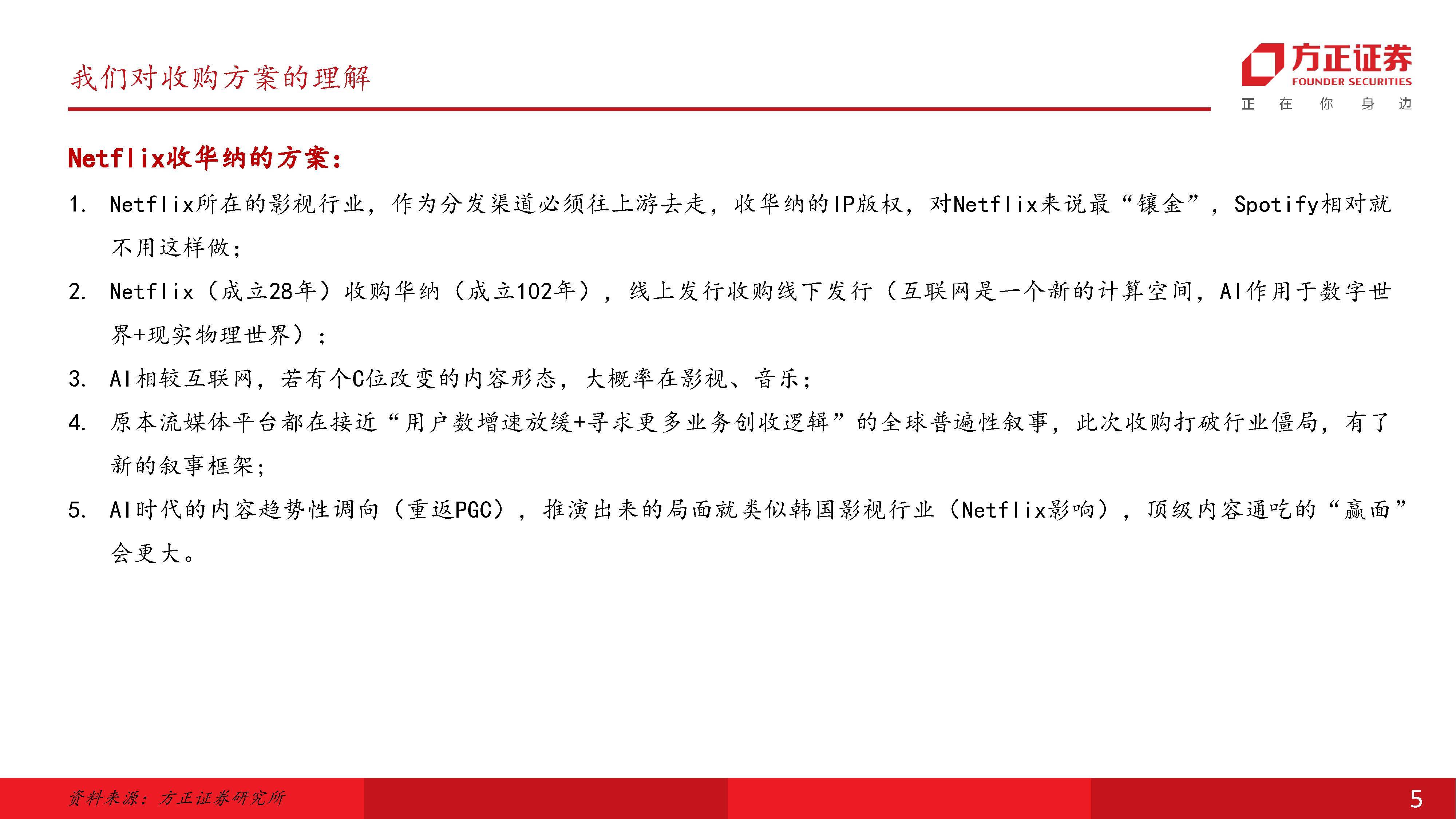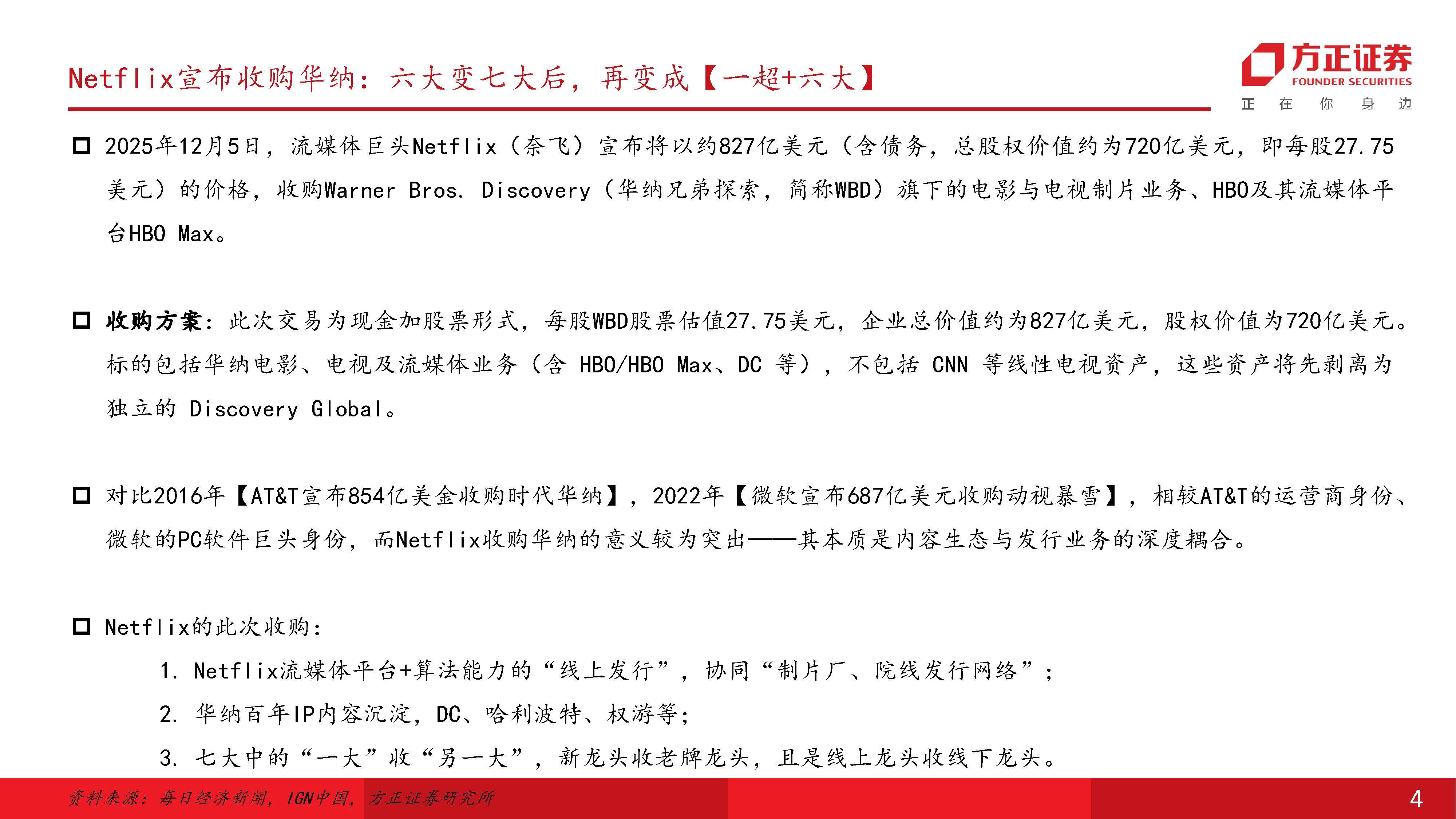 此次收购华纳,不仅是对百年IP资产的战略性吸纳,更是Netflix应对AI时代内容变革的关键落子。拥有华纳庞大的版权库与线下发行网络后,Netflix可进一步打通“线上算法推荐+线下院线协同”的全链路,提升用户ARPU值并挖掘存量用户的增量价值。同时,在AI技术赋能下,经典IP有望通过重制、衍生、互动等形式焕发新生,形成“数据—内容—渠道—变现”的闭环增强。报告指出,这一整合若顺利推进,或将催生全球娱乐产业新范式,确立“一超+六大”的新格局。