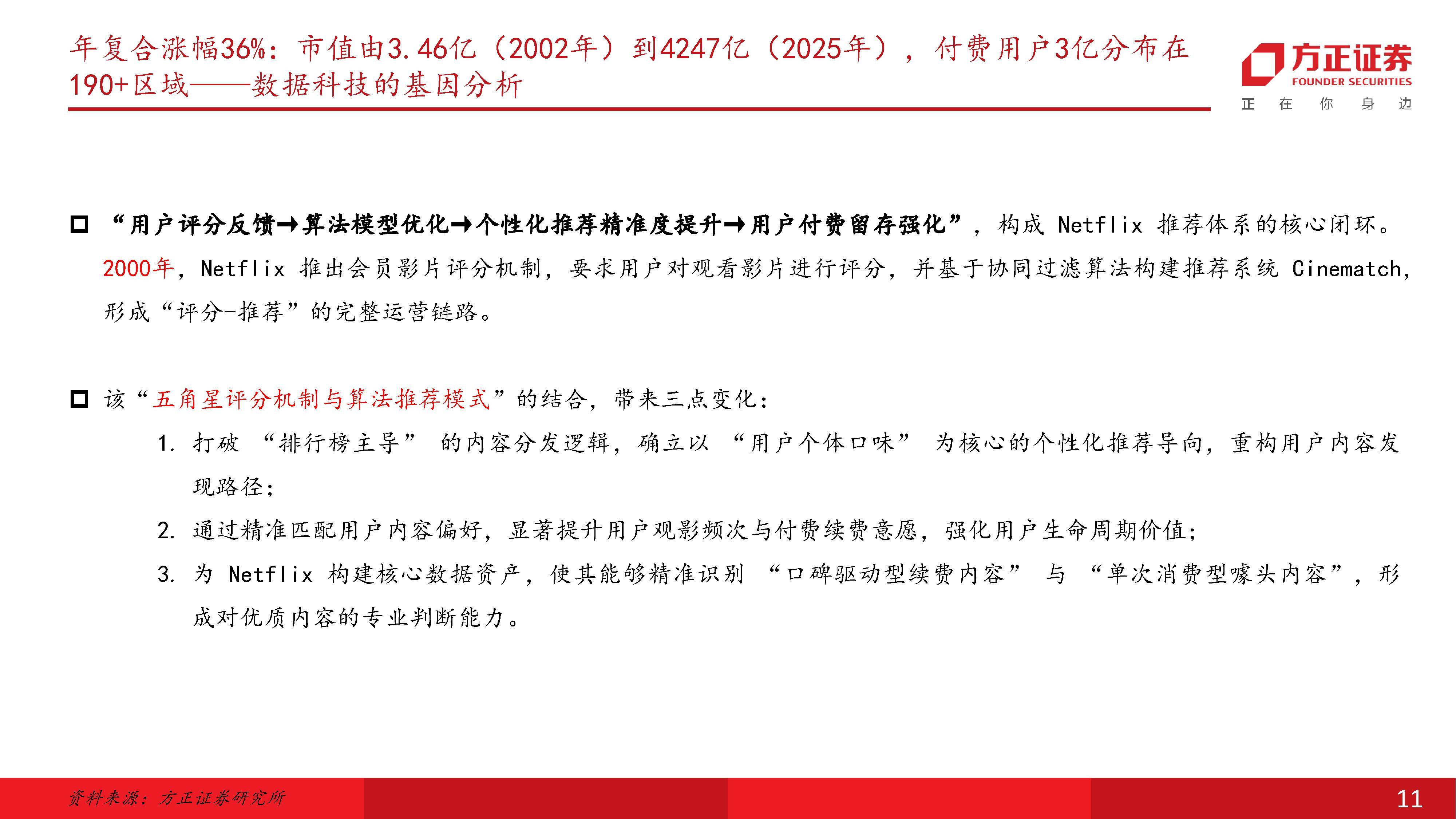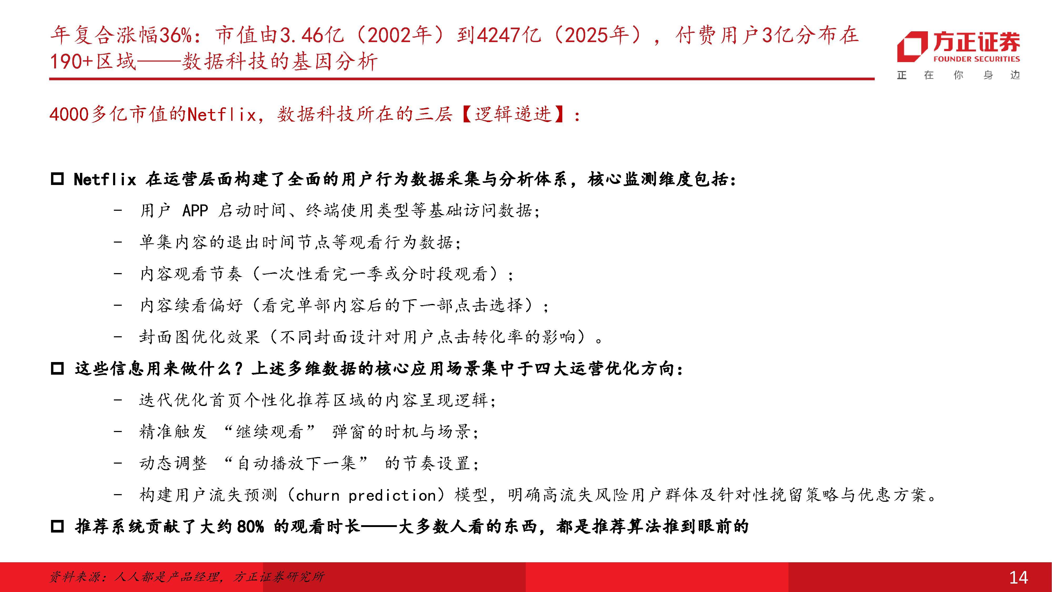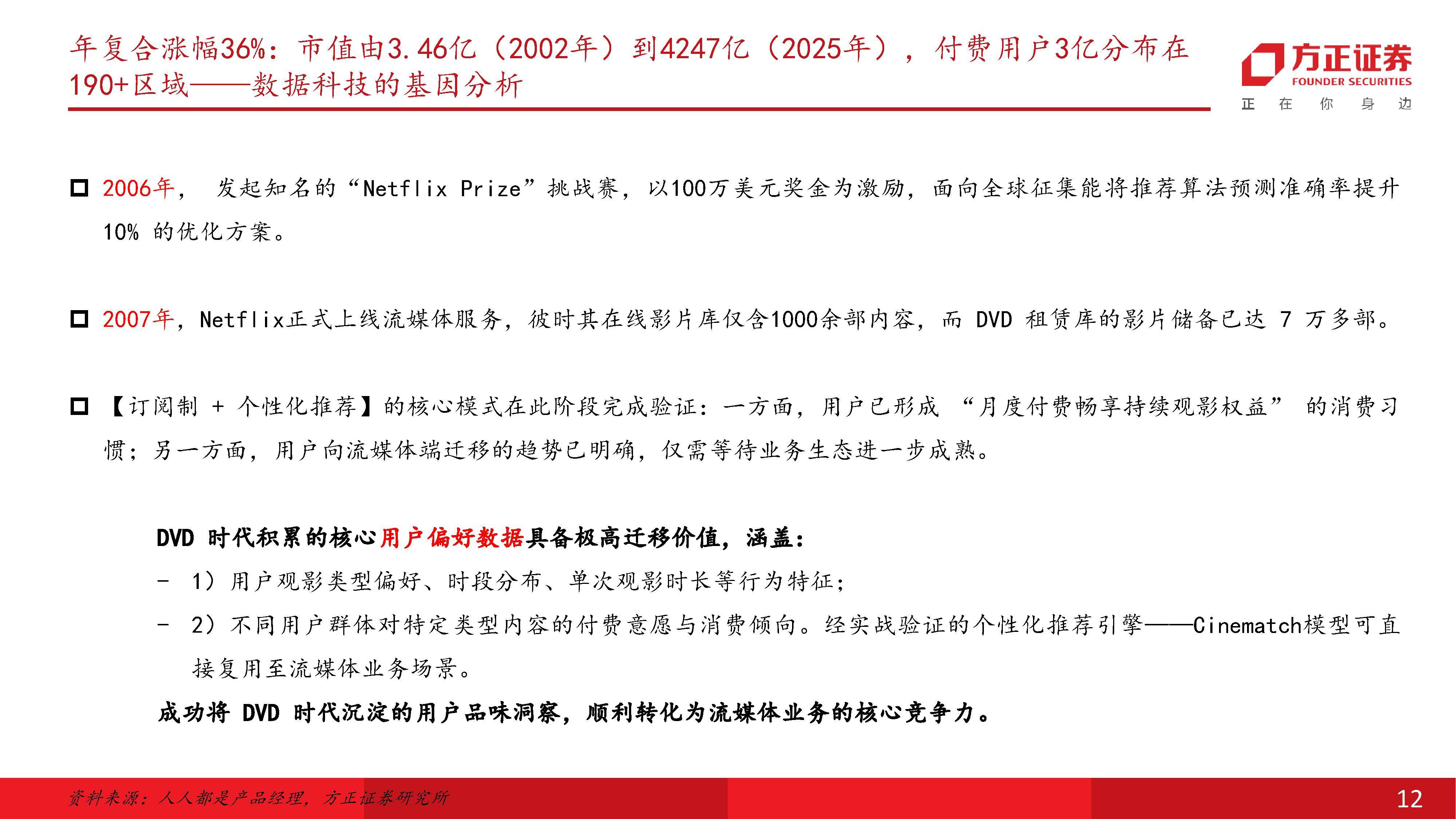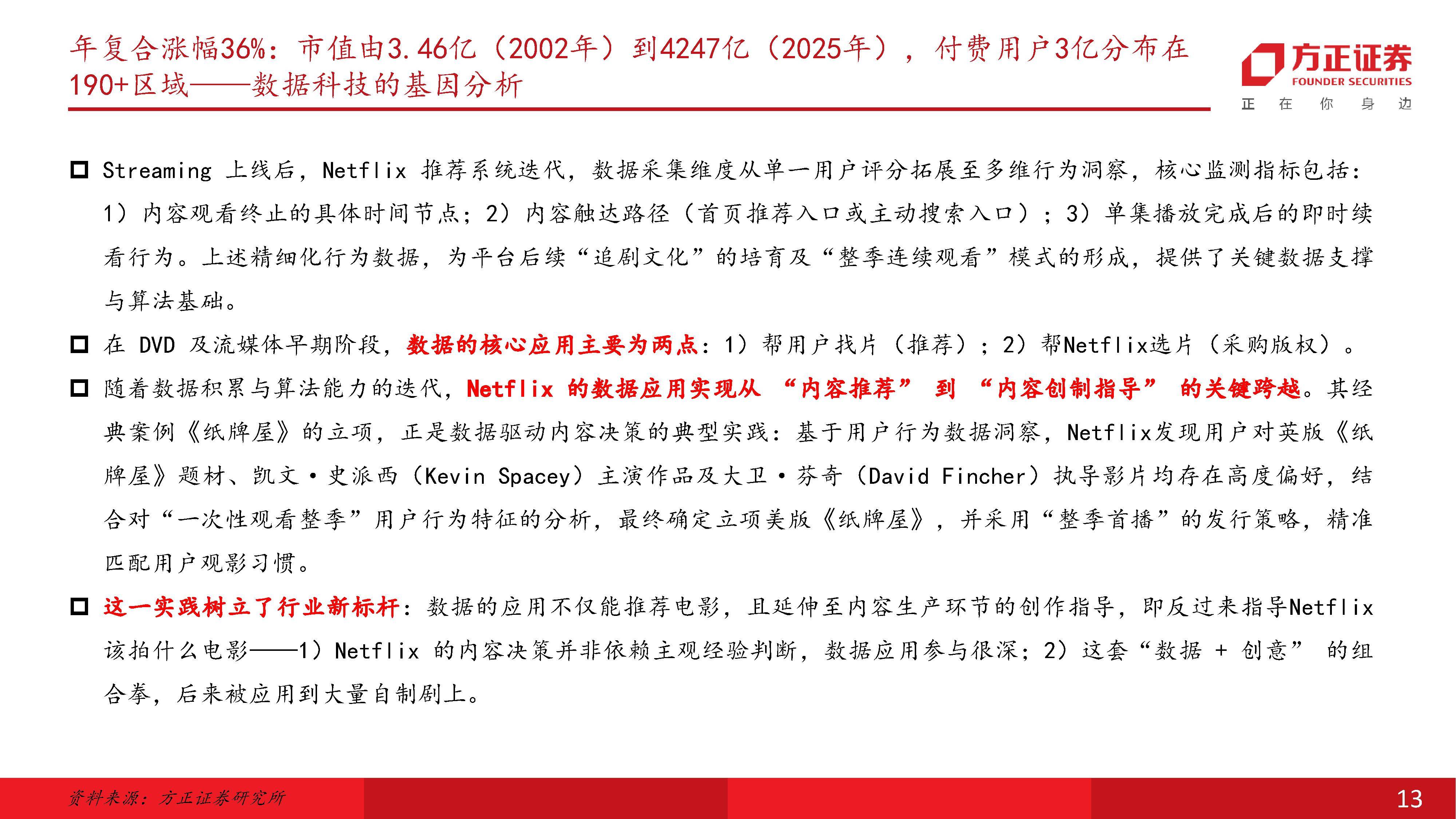Netflix的成功源于其独特的“数据科技+全球叙事”双轮驱动模式。自DVD租赁时代起,公司便构建了以用户评分和行为数据为核心的推荐系统,并逐步将数据能力延伸至内容采购乃至原创制作环节——如《纸牌屋》即为数据指导创作的经典案例。如今,其算法贡献约80%的观看时长,不仅优化用户体验,更精准识别高留存价值内容。这种“用数据讲好世界故事”的能力,使Netflix超越好莱坞传统制片逻辑:不再预设文化模板,而是赋能全球创作者,以本地语言讲述本地故事,成功推出《暗黑》《百年孤独》等非英语爆款,实现真正的全球化内容输出。