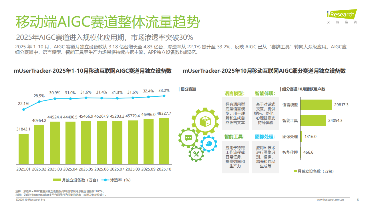 近日,艾瑞咨询发布的《2025年中国移动互联网AIGC赛道流量报告》揭示了人工智能生成内容领域的显著发展趋势。数据显示,2025年前十个月,国内AIGC赛道已稳步进入规模化应用期,月独立设备数从年初的3.18亿台增长至10月的4.83亿台,整体市场渗透率突破30%,标志着相关应用已从早期的技术尝鲜工具,转型为覆盖广泛大众的日常级服务。其中,以语音模型、智能工具为代表的生产力提升场景,用户基础最为庞大,持续占据市场主流地位。