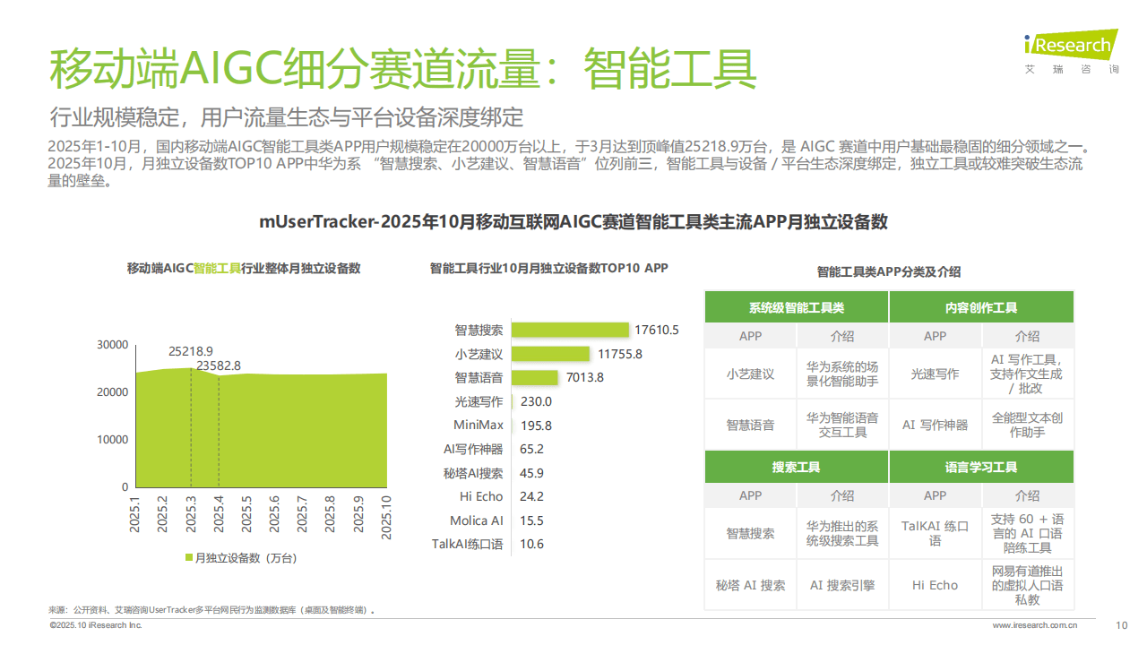 智能工具领域则呈现出用户规模大且稳定的特点,月独立设备数长期维持在2亿台以上。然而,其流量高度与终端设备及系统平台生态绑定,华为旗下的“智慧搜索”、“小艺建议”等系统级工具占据领先地位,独立工具应用面临显著的生态壁垒。