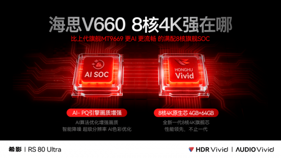 算力核心:搭载 2025 年最新华为海思 660 4K 8核芯片,配合鸿蒙 6 系统底层优化,让盛典同款 4K 高清画质与多设备协同流畅运行,AI 算力较前代提升 3 倍,低分辨率片源经 AI 超分技术重塑后可达准 4K 效果;