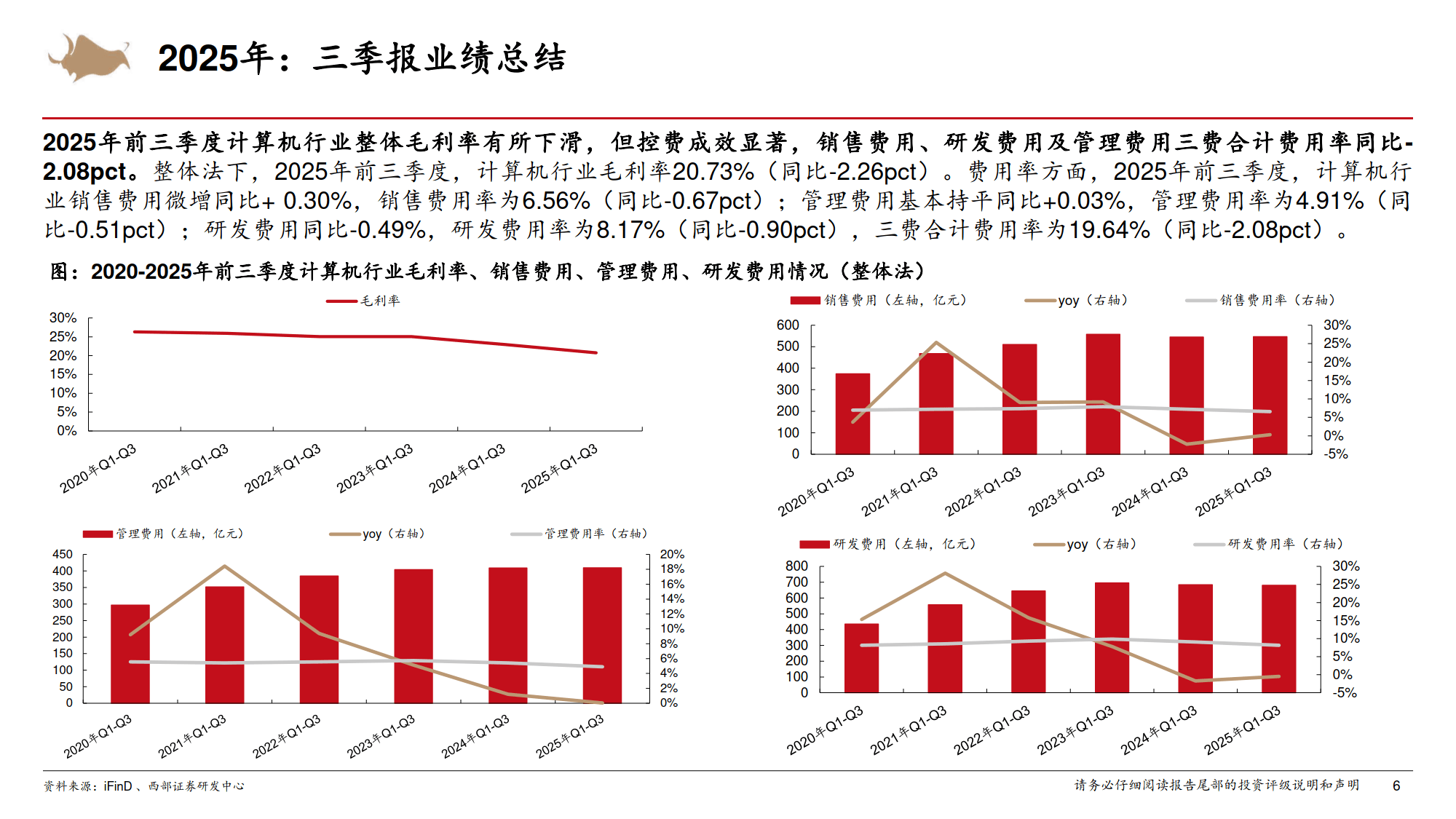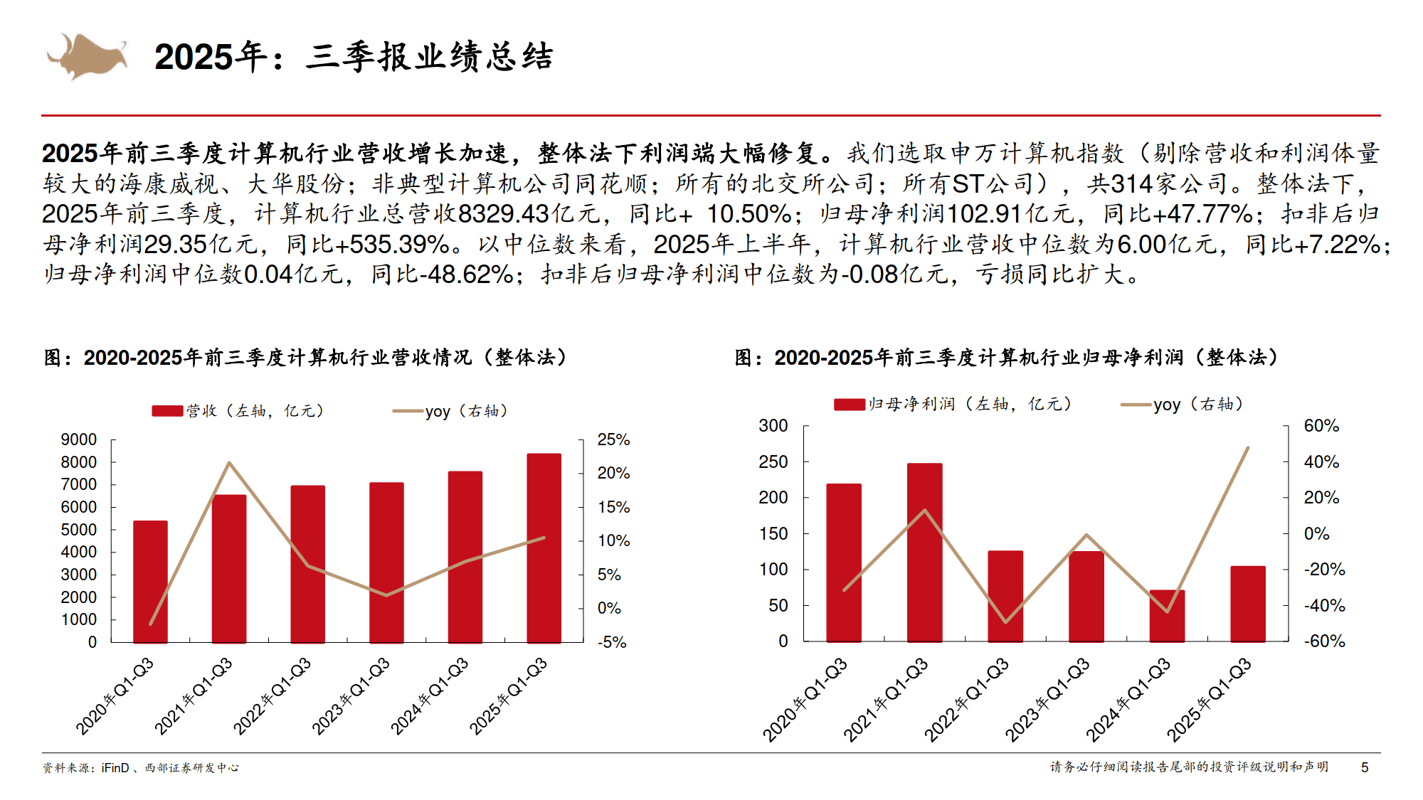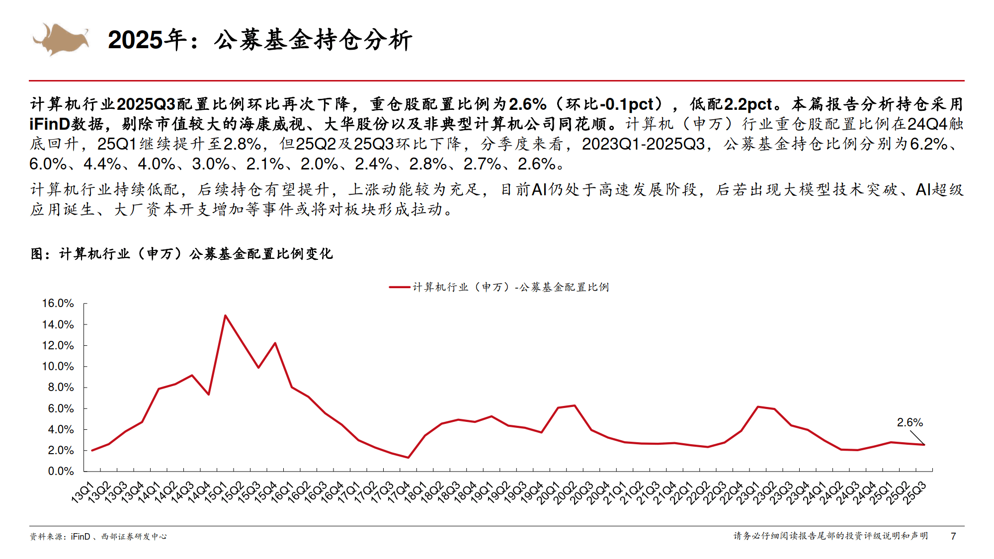 2025年行业表现先扬后抑,2月因国内AI大模型突破走出独立上涨行情,4月受外部冲击与估值压力回调后,与沪深300指数保持较高同步性,全年累计上涨14.05%。业绩方面,前三季度行业营收8329.43亿元,同比增长10.50%,归母净利润同比大增47.77%,扣非后净利润增速达535.39%,控费成效显著。公募基金持仓虽持续低配,但后续提升空间充足,重仓方向集中于AI算力、AI应用等领域。