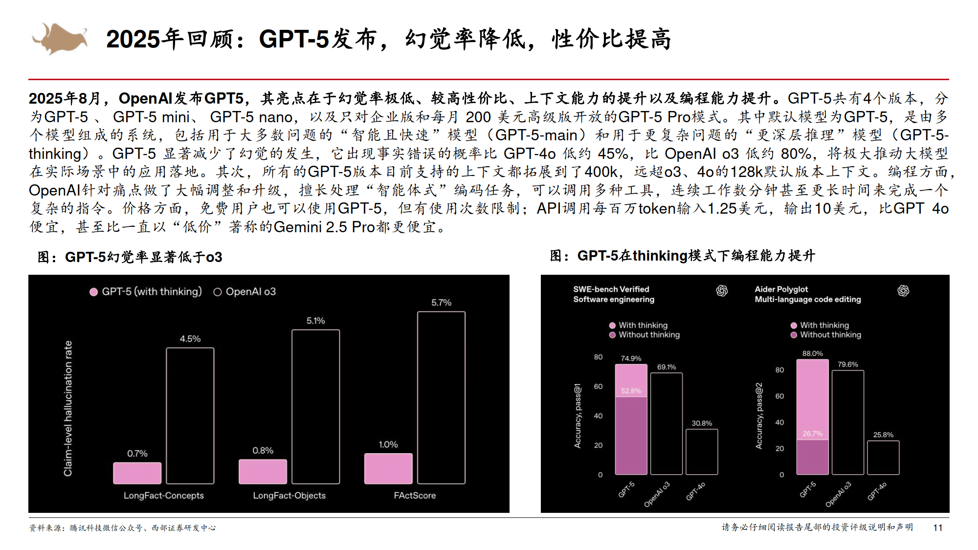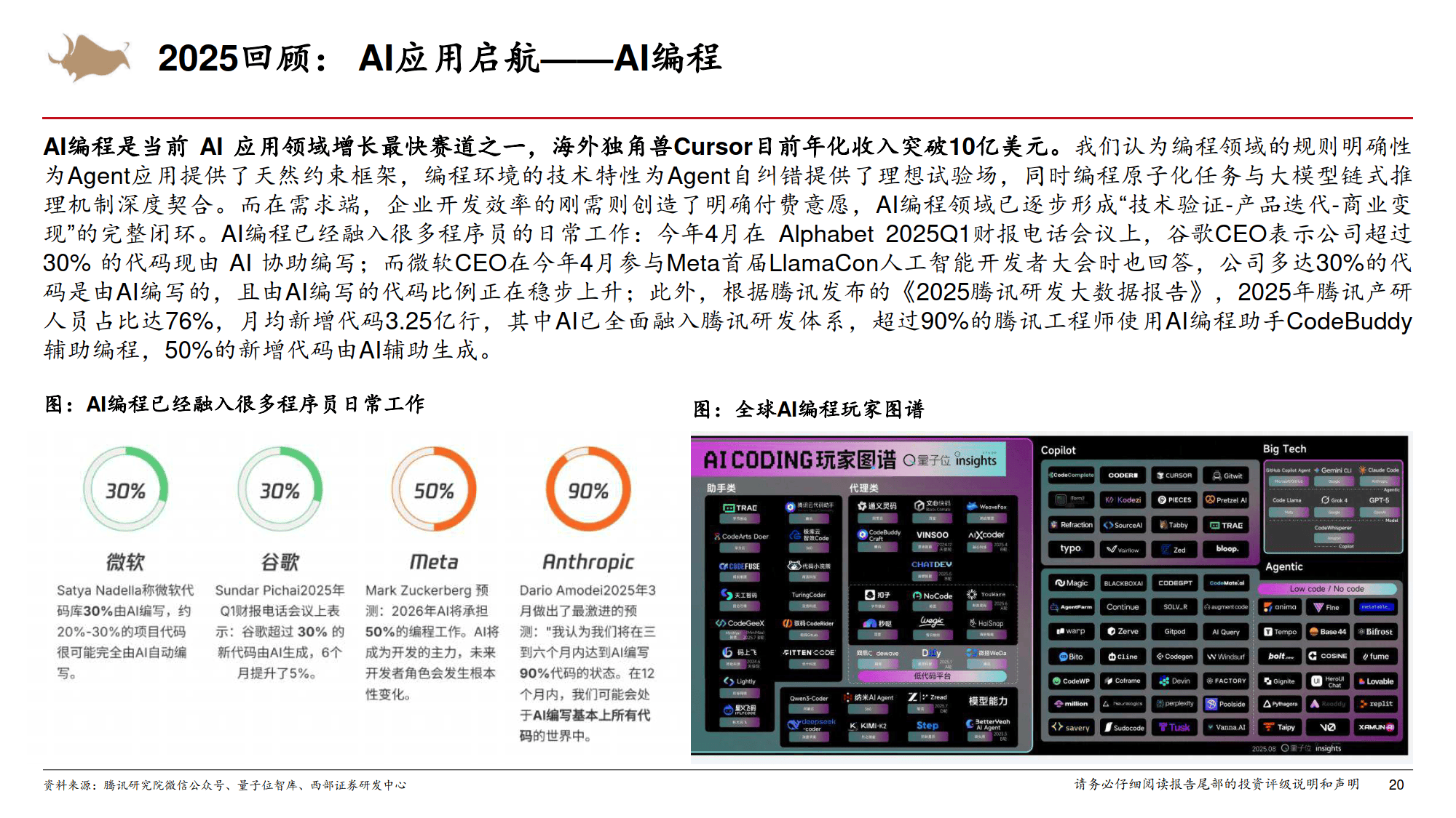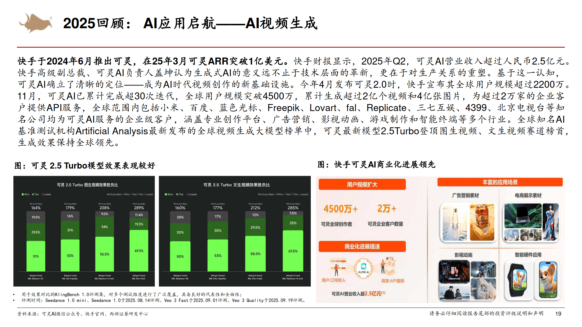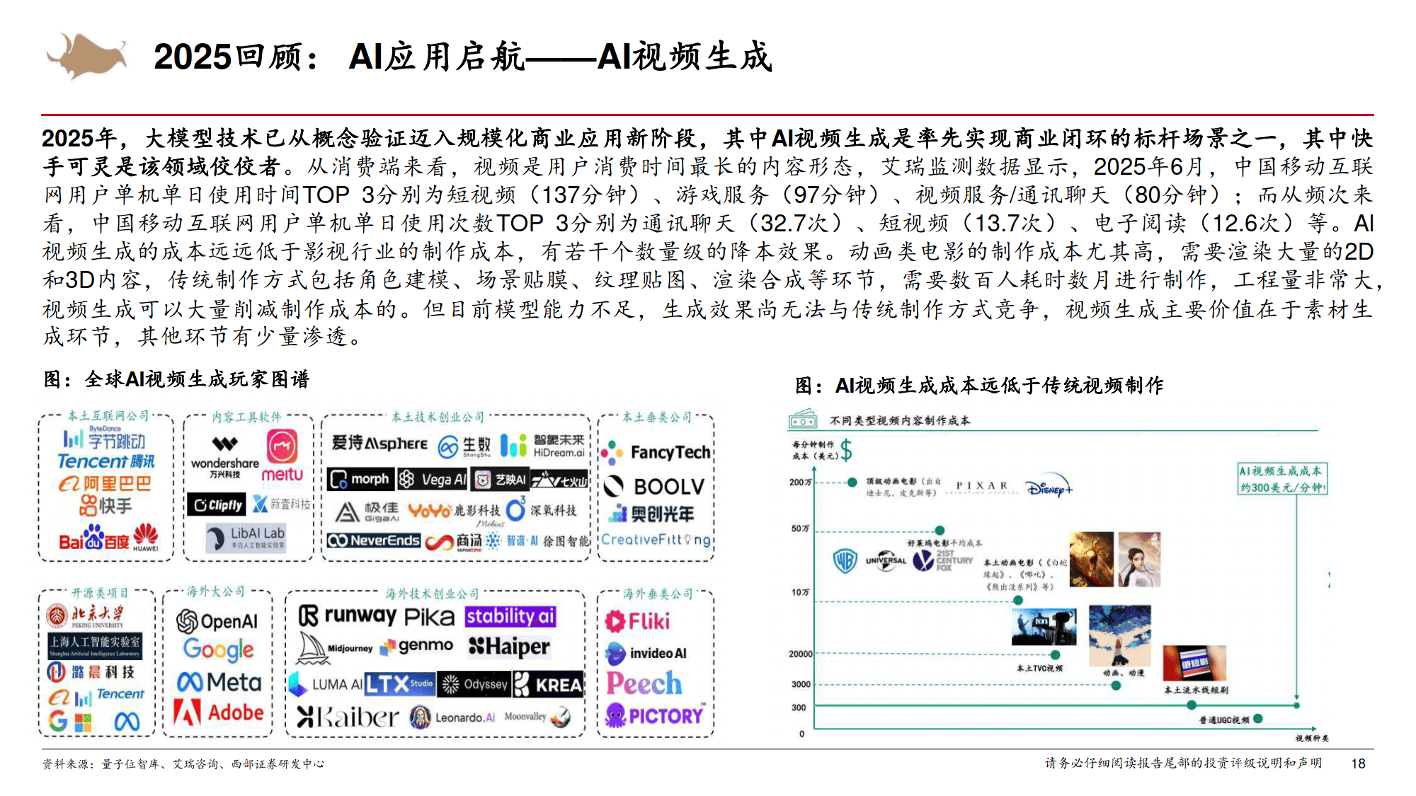 技术层面,2025年AI大模型实现跨越式发展。国内DeepSeek异军突起,R1模型性能比肩国际顶尖水平且性价比优势显著,阿里Qwen3-Max在多项评测中跻身全球第一梯队;国际上GPT-5、Gemini 3相继发布,在幻觉率控制、多模态能力、编程与Agent调用等方面大幅刷新SOTA。应用端商业化进程加速,AI视频生成(快手可灵全球用户超4500万)、AI编程(Cursor年化收入破10亿美元)成为标杆场景,企业级AI Agent部署落地,C端涌现Gemini APP(月活6.5亿)、Sora APP等爆款产品。