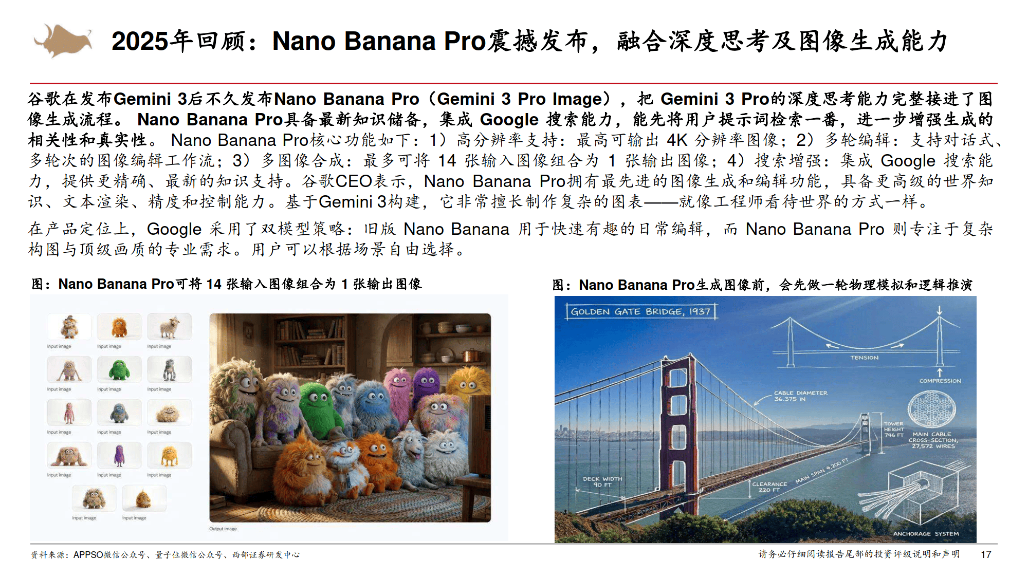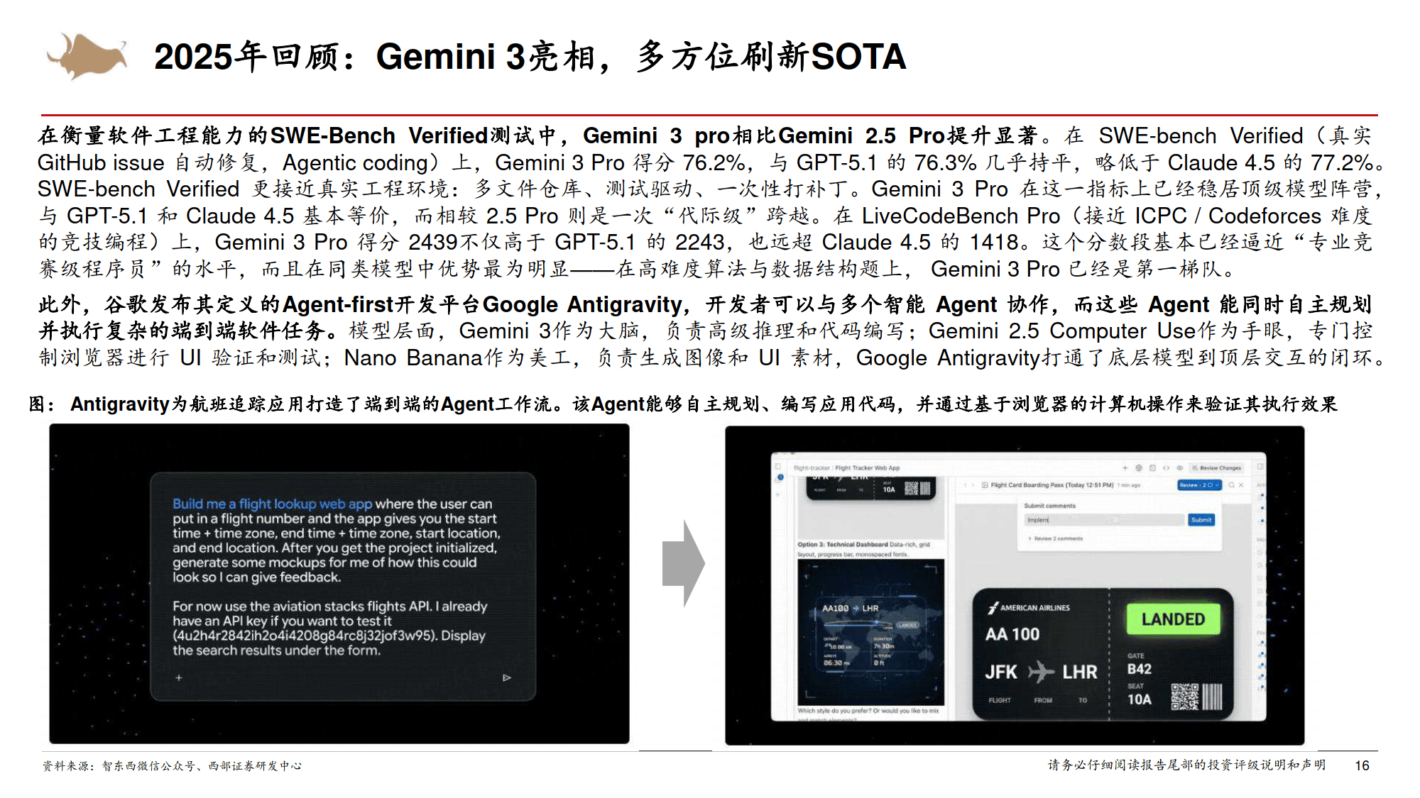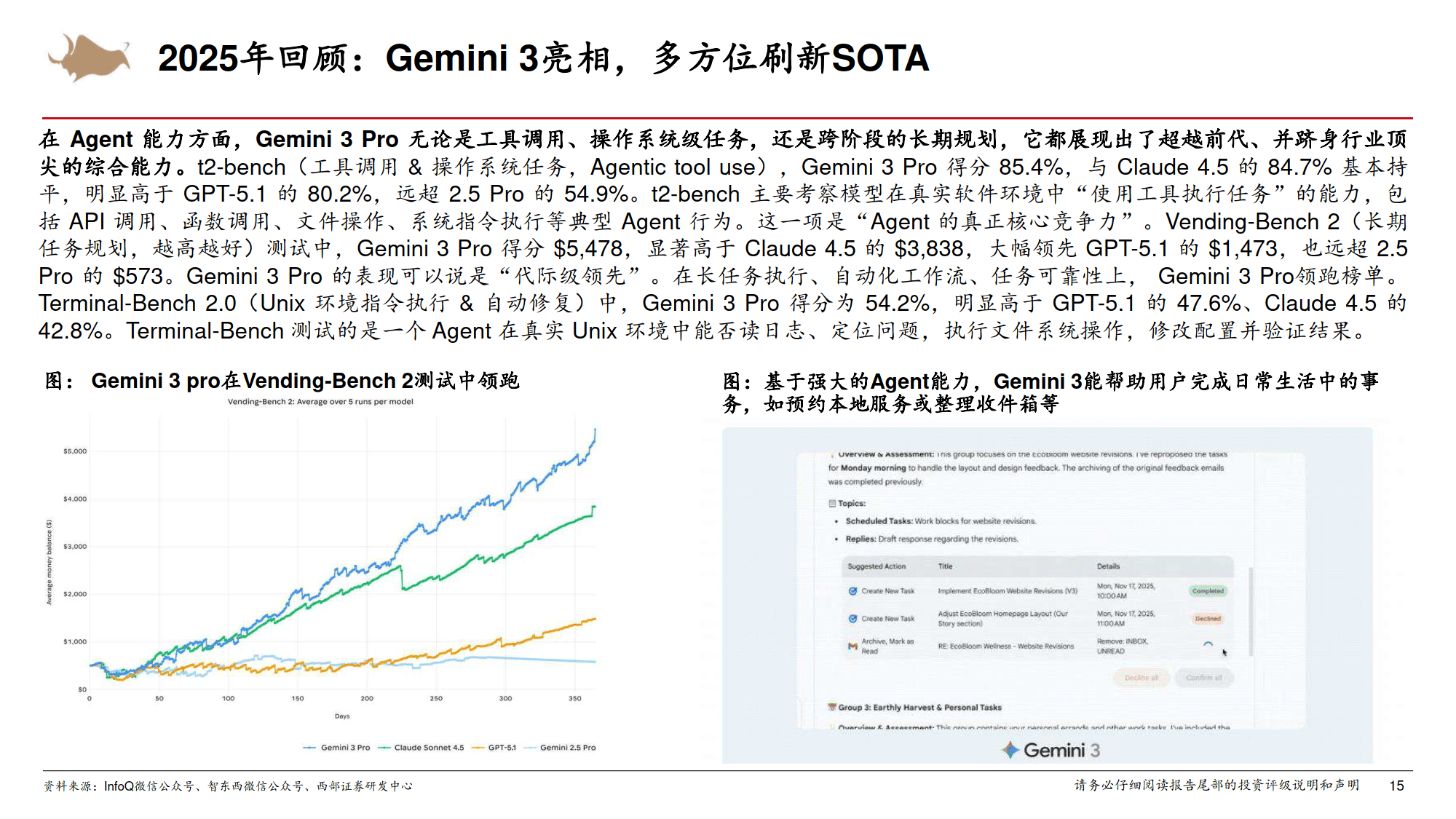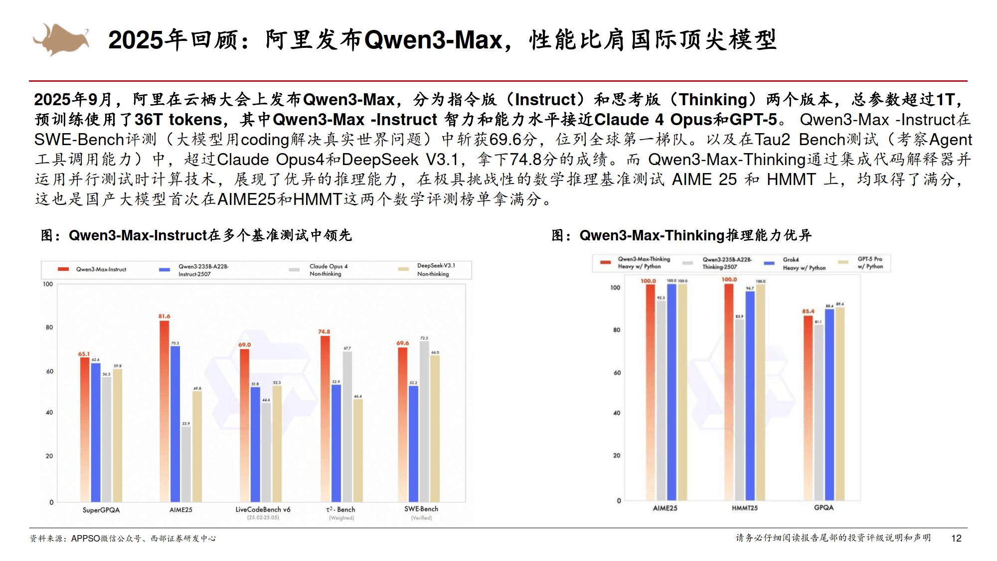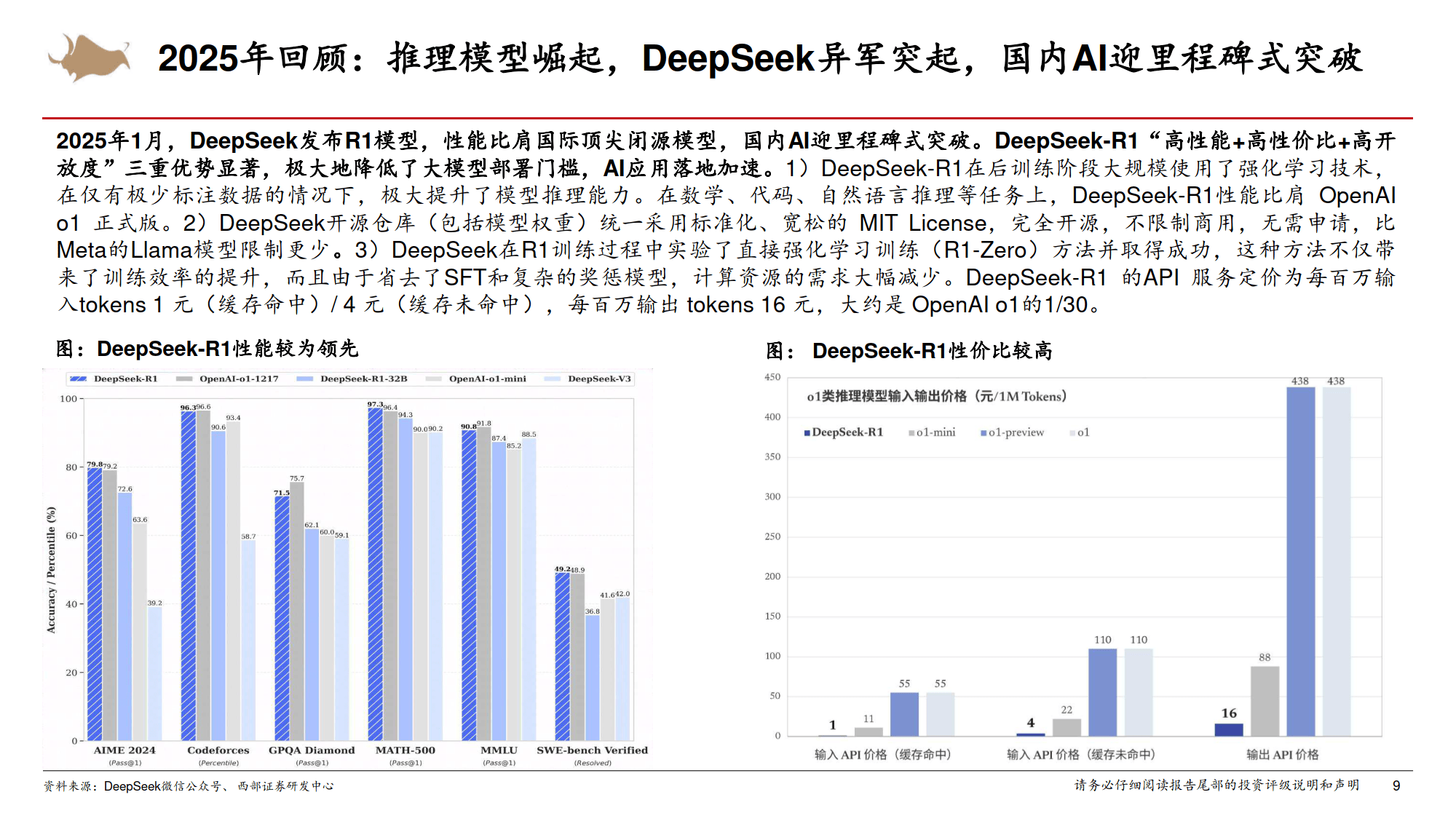 技术层面,2025年AI大模型实现跨越式发展。国内DeepSeek异军突起,R1模型性能比肩国际顶尖水平且性价比优势显著,阿里Qwen3-Max在多项评测中跻身全球第一梯队;国际上GPT-5、Gemini 3相继发布,在幻觉率控制、多模态能力、编程与Agent调用等方面大幅刷新SOTA。应用端商业化进程加速,AI视频生成(快手可灵全球用户超4500万)、AI编程(Cursor年化收入破10亿美元)成为标杆场景,企业级AI Agent部署落地,C端涌现Gemini APP(月活6.5亿)、Sora APP等爆款产品。
