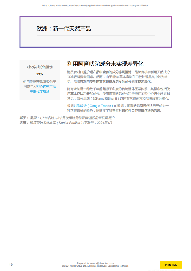 在欧洲市场,消费者对化学成分的担忧持续存在,促使品牌转向天然成分寻求突破。数据显示,近三成英国成年人关注传统牙膏中的化学成分。因此,带有植物、草本宣称的产品已十分普遍,而一些品牌则开始从阿育吠陀这一古老传统医学体系中汲取灵感,推出融合了刮舌、油漱等整体护理理念的产品。尽管这类产品目前仍属小众,但其增长势头明显,不仅满足了消费者对功能性天然成分的追求,也契合了他们对身心整体健康及可持续价值的重视。同时,面对新品发布数量下降的挑战,品牌也通过推出新颖的产品形态,如牙膏精油、双相配方漱口水以及可续装包装,来吸引追求新鲜体验的消费者。