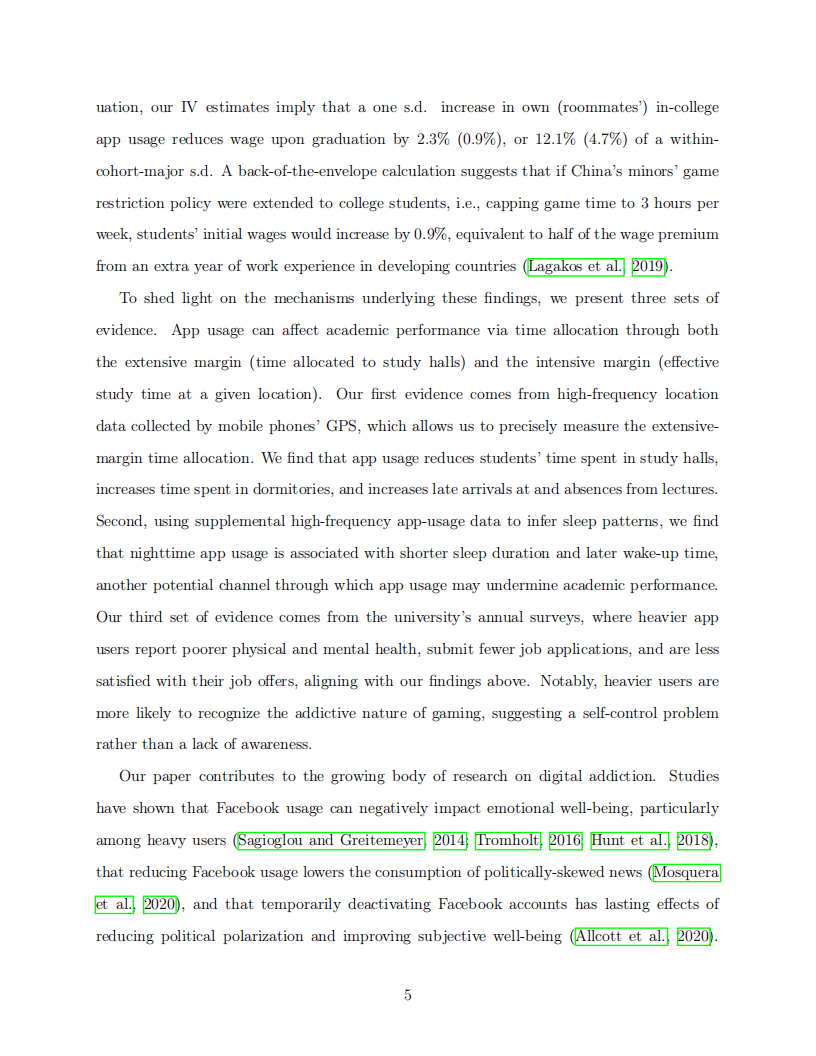 令人关注的是,这种负面影响并未随着毕业而结束。数据显示,大学期间App使用每增加一个标准差,毕业生起薪下降2.3%,而室友的使用行为也会间接导致本人工资降低约0.9%。研究估算,若将针对未成年人的游戏时长限制政策(每周3小时)扩展至大学生群体,毕业生起薪有望提升0.9%,相当于多积累半年工作经历带来的薪资增长。