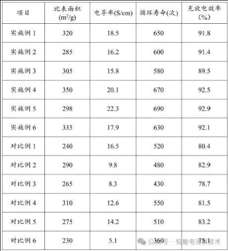 实施例1经CO2活化后比表面积320m/g、充放电效率91.8%,而对比例1(无CO2活化)因介孔数量不足,比表面积仅240m/g,充放电效率跌至80.4%。实施例4(高GNP比例)比表面积达350m/g,为硫酸铅晶体提供更多锚定位点,使充放电效率提升至92 .5%,印证介孔扩容对活性物质分散的积极作用。